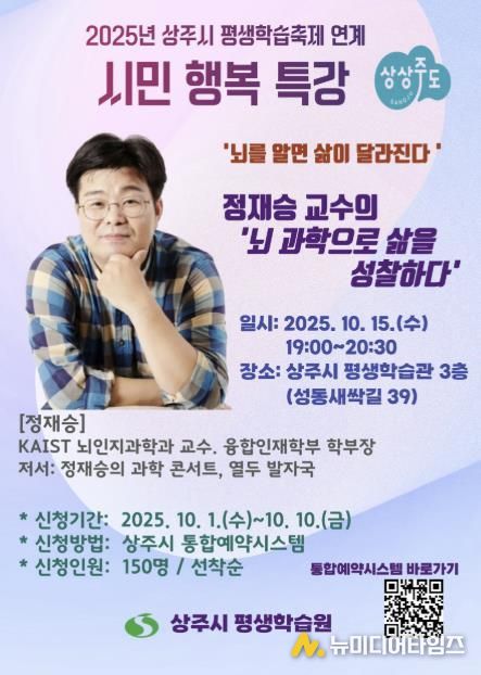 상주시 평생학습원은 2025. 10. 15. 오후 7시부터 8시30분까지 상주시 평생학습관 3층 강당에서 뇌과학자이자 미래학자인 정재승 KAIST 교수를 초청하여 특별 강연을 진행한다.