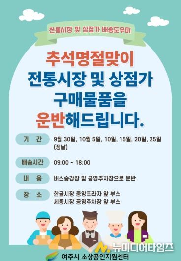 여주시는 여주시소상공인지원센터 주관으로 다가오는 추석 명절을 맞이하여 전통시장과 상점가를 찾는 시민들의 편의를 돕고 전통시장 활성화를 위해 ‘전통시장 및 상점가 배송 도우미’ 서비스를 운영한다.