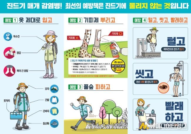 보건소 관계자는 “진드기 매개 감염병은 예방백신이 없어 야외활동 시 ▶긴소매, 긴바지, 모자 등으로 피부 노출 최소화하기 ▶4시간 간격으로 기피제 사용하기 ▶풀숲에 들어가지 않기 ▶귀가 후 즉시 목욕 및 옷 세탁 등의 예방수칙을 지키는 것이 중요하다.”고 말했다.