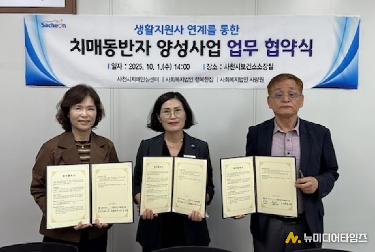 사천시 치매안심센터는 10월 1일 보건소에서 노인맞춤돌봄서비스 수행기관 2곳과 협약을 맺고, 생활지원사 50명을 ‘치매동반자’로 양성하기로 했다.