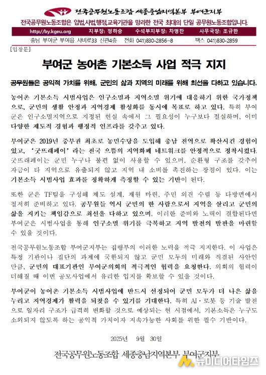 전국공무원노동조합 부여군지부는 지난 9월 30일 의견문을 통해, 부여군이 추진 중인 농어촌 기본소득 시범 사업을 적극적으로 지지하며, 군민과 함께 공모사업 유치에 최선을 다하겠다는 뜻을 밝혔다.