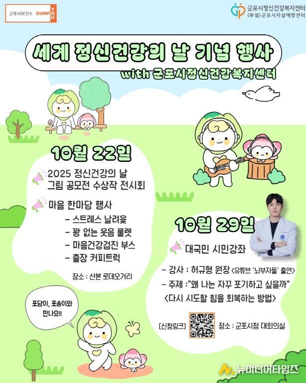 군포시정신건강복지센터 부설 군포시자살예방센터는 오는 10월 10일 세계 정신건강의 날을 맞이해 정신건강을 위한 다양한 행사를 개최할 예정이다.