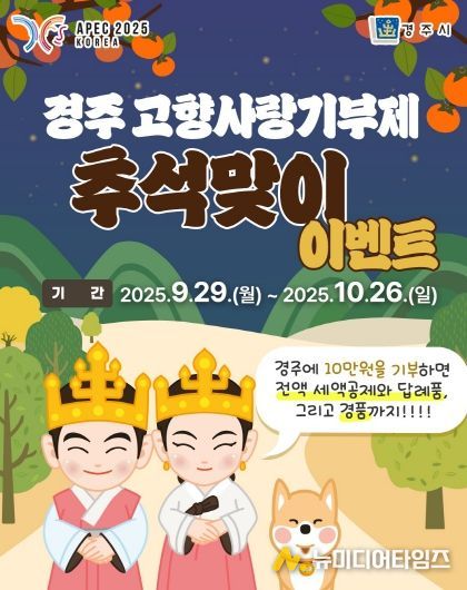 경주시는 추석을 맞아 고향사랑기부 활성화를 위해 지난달 29일부터 오는 10월 26일까지 ‘고향사랑기부제 추석맞이 특별이벤트’를 진행한다고 밝혔다.