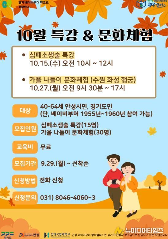 안성 베이비부머 행복캠퍼스(한경국립대학교 평생교육원)는 오는 10월 15일부터 27일까지 중장년 안성시민(경기도민)을 대상으로 ‘10월 특강(심폐소생술) 및 문화체험(수원화성행궁)’ 프로그램을 운영한다고 밝혔다.
