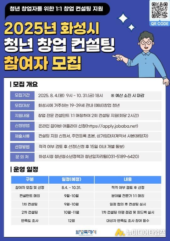 화성특례시가 오는 31일까지 ‘2025년 청년 창업 컨설팅 지원사업’ 참여자를 모집한다.