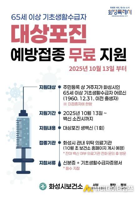 화성특례시가 오는 13일부터 65세 이상 기초생활수급자 어르신들의 건강 증진과 의료비 부담 완화를 위해 대상포진 예방접종 비용을 전액 지원한다고 2일 밝혔다.