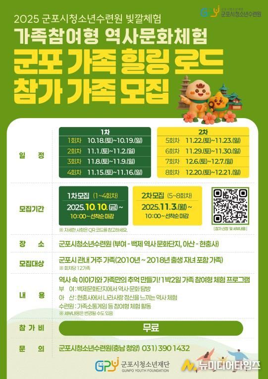 군포시청소년재단이 운영하는 군포시청소년수련원(충남 청양)은 관내 가족을 대상으로 2025년 가족참여형 역사문화탐방 '군포가족 힐링로드' 참가자를 모집한다.