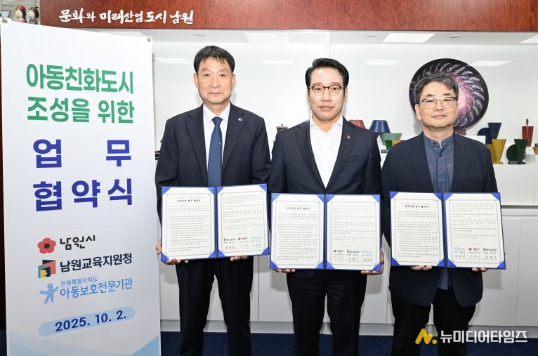 남원시는 지난 2일 남원교육지원청, 전북동부아동보호전문기관과 함께 아동친화도시 조성 및 아동 권리 증진을 위한 업무협약식을 체결했다.