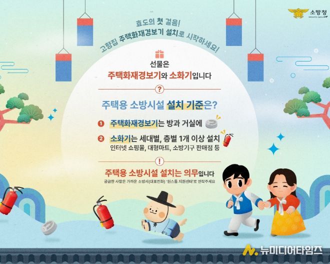 이 캠페인은 고향을 찾는 귀성객들이 부모님과 가족의 건강만큼이나 화재 안전에도 관심을 가져달라는 취지로 마련됐다. 소화기와 단독경보형 감지기만 설치해도 주택 화재 발생 시 신속히 대처할 수 있어 인명 피해를 크게 줄일 수 있다. 그래서 ‘안전은 최고의 선물’이라는 메시지와 함께 주택용 소방시설을 선물하는 문화를 권장하고 있다.