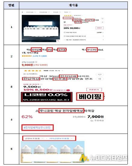 식품의약품안전처는 시중에서 판매되는 ‘무니코틴 표방 액상 흡입제품’에 대해 ‘의약외품(니코틴이 포함되지 않은 흡연욕구저하제, 흡연습관개선보조제)’ 오인 우려 광고로 보아 지난 9월 집중 점검을 실시했다.