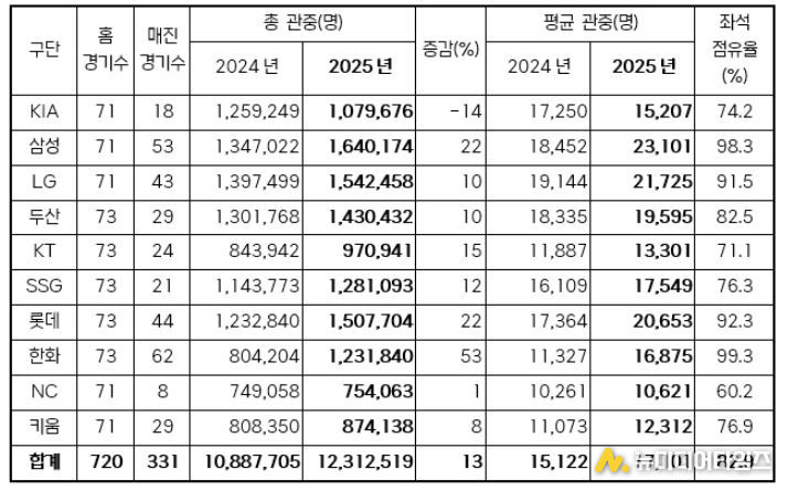 - 2025 시즌 최종 관중 1,231만 2,519명. 9개 구단이 역대 최다 관중 기록