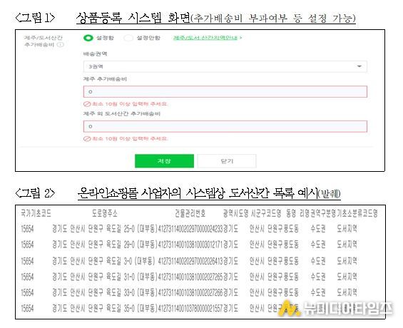 이에 따라, 공정위는 주요 6개 택배사 및 18개 온라인쇼핑몰에 대한 추가배송비 부과 실태 점검을 실시했으며, 그 결과 13개 온라인쇼핑몰 사업자가 ‘도서’와 우편번호가 동일한 일부 ‘연륙도서’로 상품을 주문하는 소비자에게 추가배송비가 자동 부과되도록 시스템을 운영하여, 해당 시스템을 이용하는 온라인쇼핑몰 사업자 자신(직접 통신판매업 운영) 또는 입점업체(이하 ‘입점업체 등’)가 택배사로부터 추가배송비를 부과 받지 않았음에도 일부 연륙도서 소비자에게 추가배송비가 부과되고 있었음이 확인됐다.