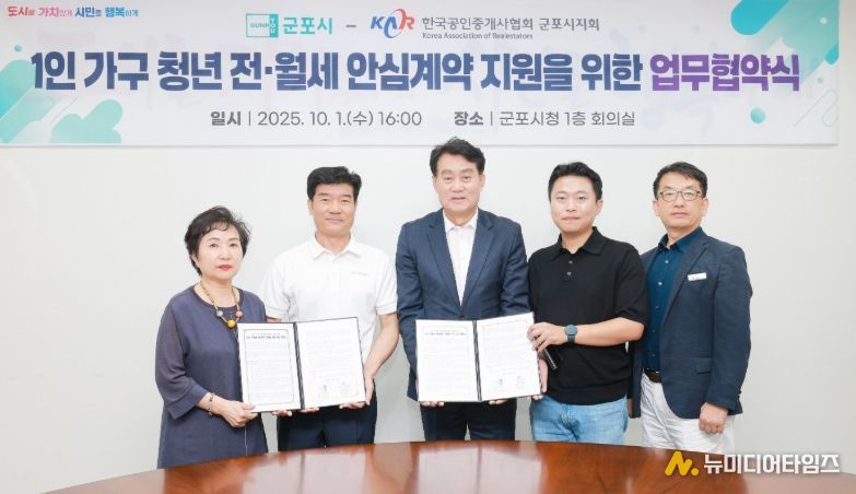 군포시는 10월 1일 시청 1층 회의실에서 한국공인중개사협회 군포시지회와 청년 1인 가구 전월세 안심계약 지원을 위한 업무협약을 체결했다.
