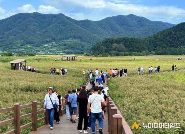 추석 연휴 순천만습지를 찾은 방문객들이 가을 정취 속에서 갈대밭 산책을 즐기고 있다.