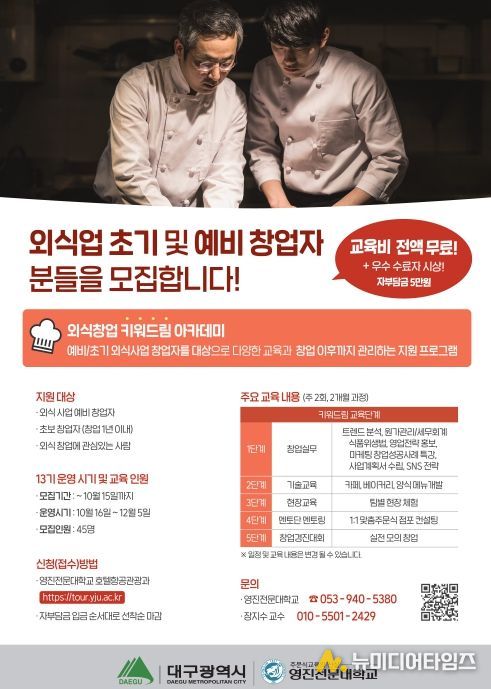 대구광역시는 외식업 예비창업자와 초기 창업자의 안정적 정착을 지원하기 위해 외식창업 ‘키워드림’ 아카데미 13기 참가자를 10월 15일까지 모집한다.
