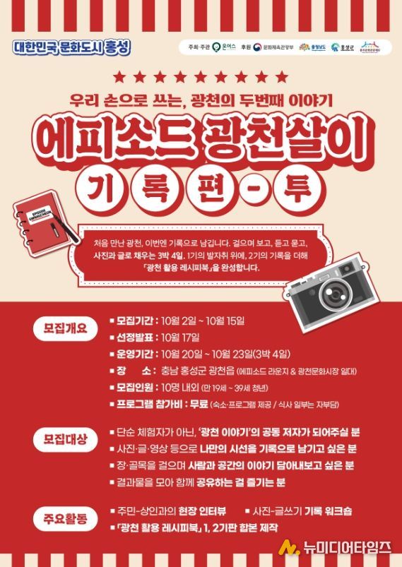 홍성군은 청년들이 지역의 삶을 직접 체험하고 기록하는 로컬살이 프로젝트 ‘에피소드 광천살이 – 기록편 2기’ 참가자를 10월 15일까지 모집한다고 밝혔다.