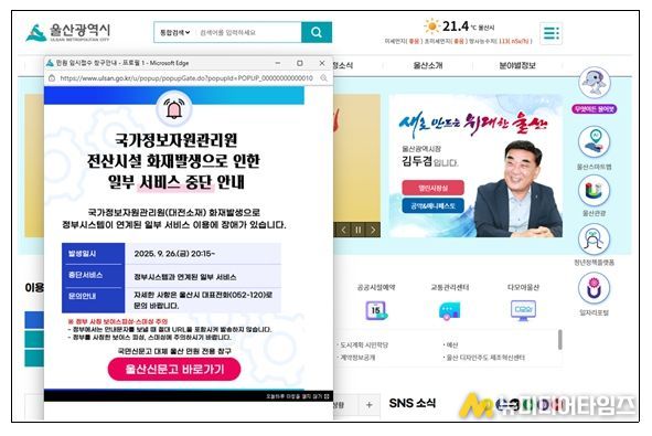 울산시는 국가정보자원관리원 대전센터 화재(9.26)로 인해 국민신문고 서비스가 전면 중단됨에 따라, 시민 불편을 최소화하기 위해 울산시 대표 홈페이지 내 온라인 민원창구 ‘울산신문고’를 10월 5일부터 운영한다.