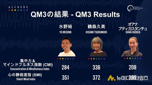 챌린지 참가자인 오아나 부디카스탄쿠(Oana Budicastancu), 츠루모리 히사미(Hisami Tsurumori), 미즈노 유(Yu Mizuno)씨 중 츠루모리씨가 가장 높은 QM3™ 점수를 기록했다. 그녀는 "20년 전 질병에 걸린 일을 계기로 명상을 시작한 뒤 매일 수행해왔다"면서 "삶에서 스트레스와 불안을 느끼는 분에게 명상이 내게 그랬듯 내적 평화를 가져다주길 바란다"고 전했다.