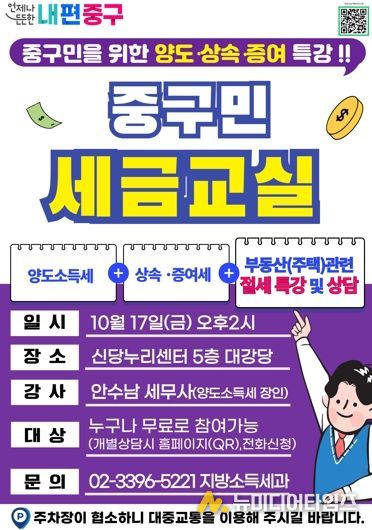 서울 중구가 어렵게만 느껴지는 세금에 대한 이해를 돕기 위해 오는 17일 오후 2시 신당누리센터 5층 대강당에서 '중구민 세금교실' 특강을 연다.