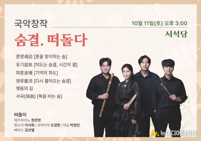 사람은 태어나고, 관계를 맺으며 살아가고, 언젠가 떠난다. 그러나 떠난다고 해서 모든 것이 사라지는 것은 아니다. 우리가 남긴 기억과 흔적은 주변 사람들의 마음속에서 순환하며, 삶과 죽음의 경계를 허문다. 퓨전국악 단체 떠돌이의 '숨결, 떠돌다'는 만남과 이별, 떠돎과 순환이라는 삶의 본질을 음악으로 풀어낸 무대다. 한국 전통 음악의 뿌리를 기반으로 하면서도 현대적 감각을 더한 이 공연은, 익숙하면서도 새로운 음악적 경험을 통해 생과 사의 의미를 되새기는 시간을 선사한다.