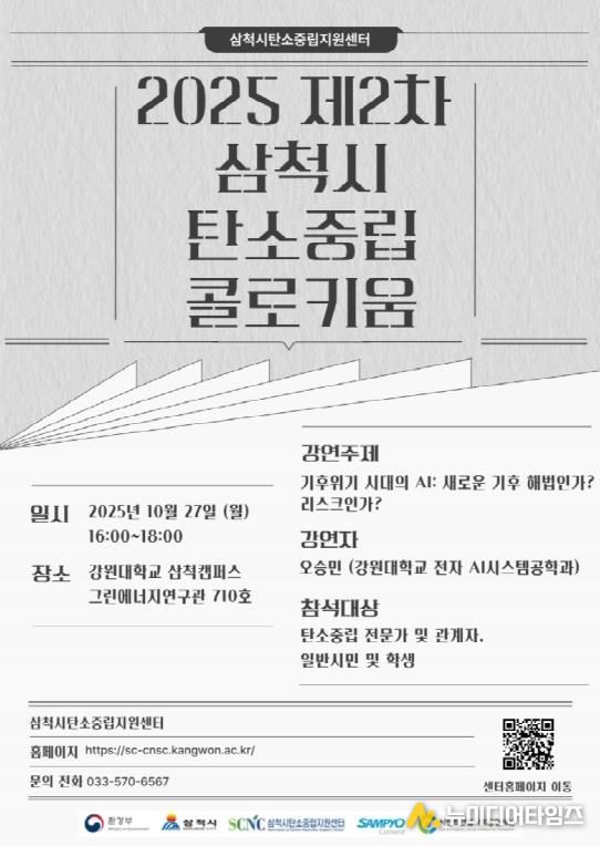 삼척시탄소중립지원센터는 기후변화에 적극 대응하고 지속 가능한 탄소중립 사회 실현을 위한 노력의 일환으로 오는 10월 27일 오후 4시부터 강원대학교 삼척캠퍼스 그린에너지연구관에서 ‘2025 제2차 삼척시 탄소중립 콜로키움’을 개최한다고 밝혔다.