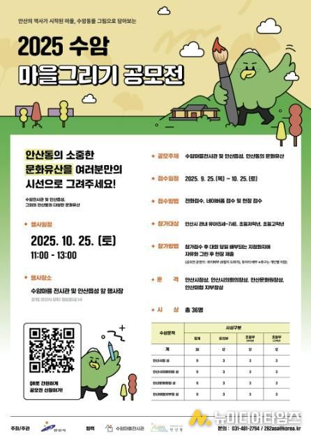 공모전은 관내 유아(5~7세)·초등부(저학년)·초등부(고학년) 등으로 구분돼 열린다. 그리기 공모전 주제는 ▲수암마을전시관 ▲안산읍성 ▲안산동의 문화유산이다.