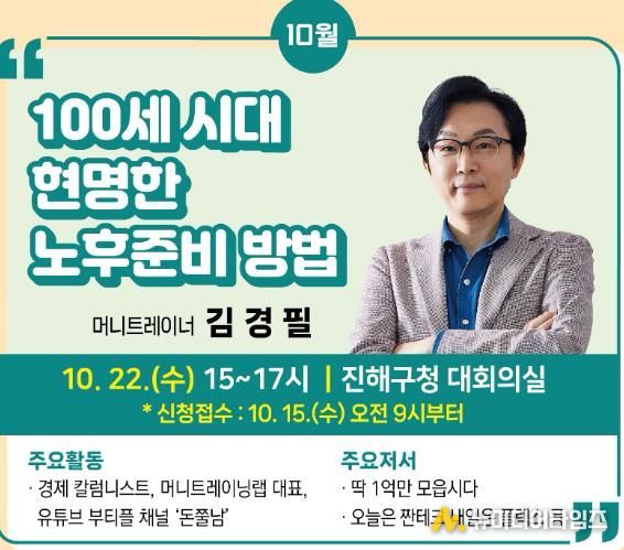 한편, 창원아카데미 10월 강연 사전신청은 10월 15일 오전 9시부터 창원시 홈페이지(시민참여-모집신청접수)에서 재테크에 관심있는 시민 누구나 무료로 신청 가능하다.