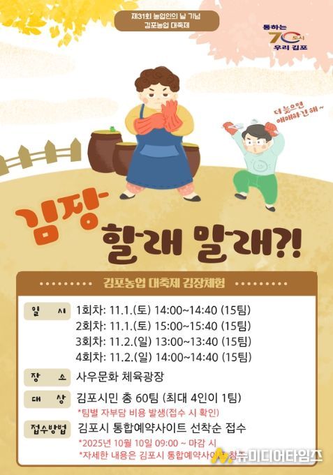 이번 김장체험 행사 참가자는 10월 10일 오전 9시부터 김포시 통합예약사이트를 통해 선착순으로 모집한다.