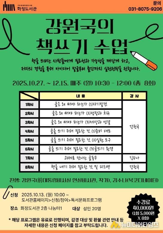 고양특례시는 10월 27일부터 12월 15일까지 매주 월요일 오전 10시 30분부터 12시까지, 화정도서관 2층 나눔터1에서 ‘강원국의 책쓰기 수업’프로그램을 운영한다고 밝혔다.