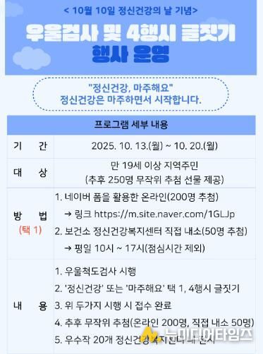 이번 행사는 만 19세 이상 지역 주민을 대상으로 진행되며, 우울감 조기 발견과 긍정적인 정신건강 메시지 확산을 위해 기획됐다.