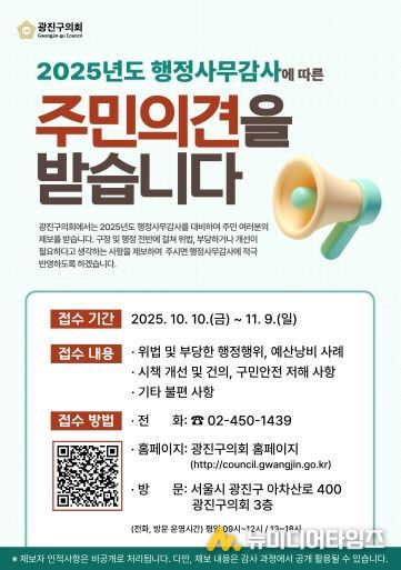 광진구의회가 오는 11월 17일부터 진행되는 ‘2025년도 행정사무감사’를 앞두고 주민 의견을 10월 10일부터 11월 9일까지 총 31일간 접수한다.