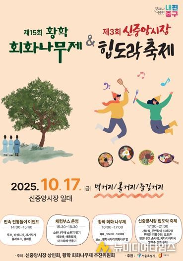 서울 중구 황학동의 오랜 전통을 품은‘황학회화나무제’와 젊은 감각이 살아 있는‘신중앙시장 힙도락(HIP:道樂) 축제’가 오는 17일 오후 2시에 함께 열린다. 두 축제는 2023년부터 연계 개최해, 황학동의 가을을 더욱 풍성히 채우고 있다.
