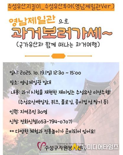 수성구자원봉사센터 소속 수성유산지킴이는 오는 19일 영남제일관 일대에서 지역 주민을 대상으로 한 문화 체험 프로그램 ‘영남제일관으로 과거 보러 가세’를 진행한다.