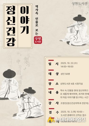용인시 상현도서관은 오는 22일 오후 2시 ‘정신건강의 날’을 기념해 시민 대상 공개강좌 ‘역사 속 인물로 보는 정신건강 이야기’를 개최한다.