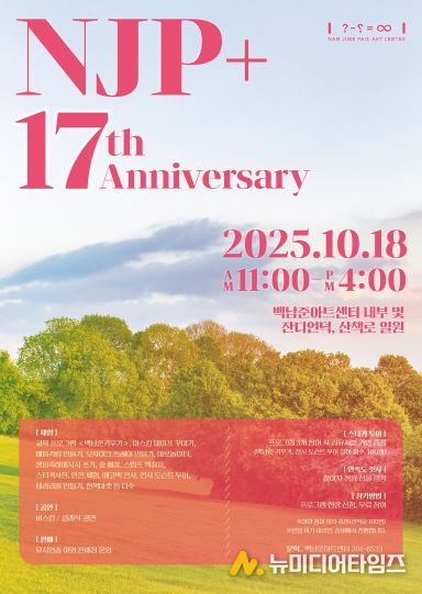 경기문화재단 백남준아트센터(NJP, 관장 박남희)는 2025년 10월 18일, 개관 17주년 기념 축제 'NJP+'를 연다. 특히 이번 행사는 백남준아트센터와 경기도박물관, 경기도어린이박물관으로 이어지는 산책로 환경개선과 맞물려 축하의 의미를 더하고 있다. 아트센터는 올해 시민 예술 교육프로그램인 ‘퍼블릭 아카데미’ 운영, 지역 연계 협력 축제인 ‘제8회 머내마을영화제’ 공동체 상영관 참여, 유휴부지에 공유 정원을 조성하는 ‘이키로(2km) 정원행동 캠페인’ 등 지역과 환경을 잇는 새로운 고객서비스 프로그램을 기획·추진하고 있다.
