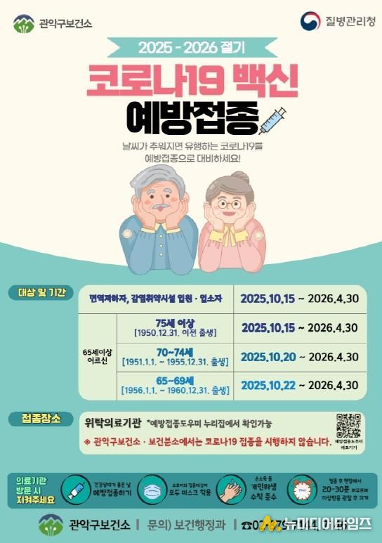 구는 오는 15일부터 호흡기 질환 고위험군인 ▲65세 이상 어르신 ▲면역저하자 ▲감염취약시설 입원‧입소자 등을 대상으로 코로나19 백신 무료 접종을 시행할 예정이다.