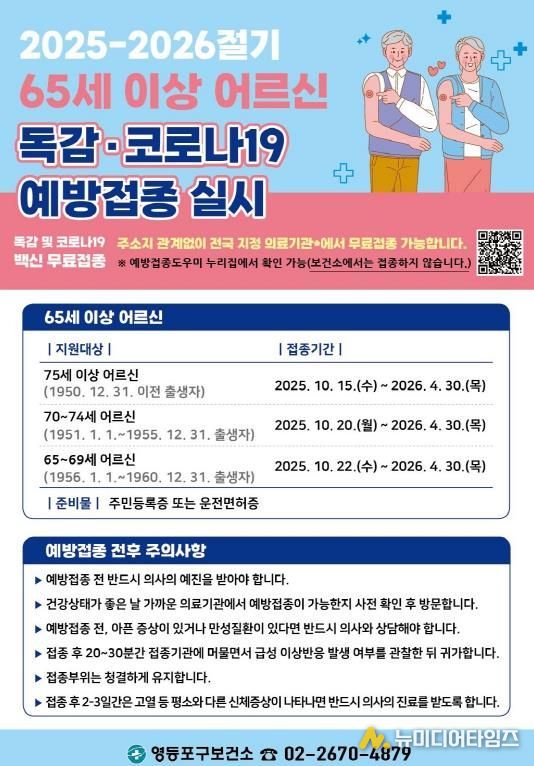 영등포구가 겨울철 감염병 유행에 대비해 65세 이상 어르신을 대상으로 독감 및 코로나19의 동시 무료 예방접종을 권장한다고 밝혔다.