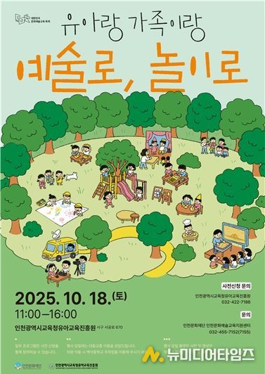 (재)인천문화재단은 인천광역시교육청유아교육진흥원과 협력하여 2025 대한민국 문 화예술교육 축제와 연계된 '유아랑 가족이랑 예술로, 놀이로' 행사를 10월 18일 오전 11시부터 오후 4시까지 인천광역시교육청유아교육진흥원에서 개최한다.