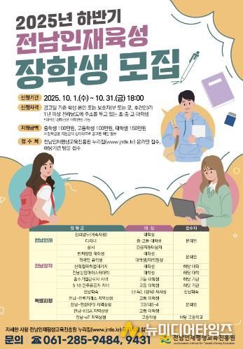 전라남도와 전남인재평생교육진흥원은 실질적인 교육기회 보장과 미래인재로의 성장, 지역 정착을 지원하기 위한 2025년 하반기 전남인재육성 장학생을 오는 31일까지 모집한다.