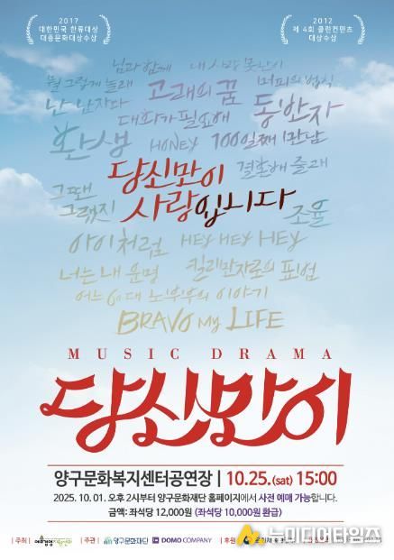 양구문화재단은 깊어가는 가을, 가족 모두가 함께 즐길 수 있는 뮤지컬 ‘당신만이’를 오는 25일 오후 3시, 양구문화복지센터 공연장에서 선보인다.