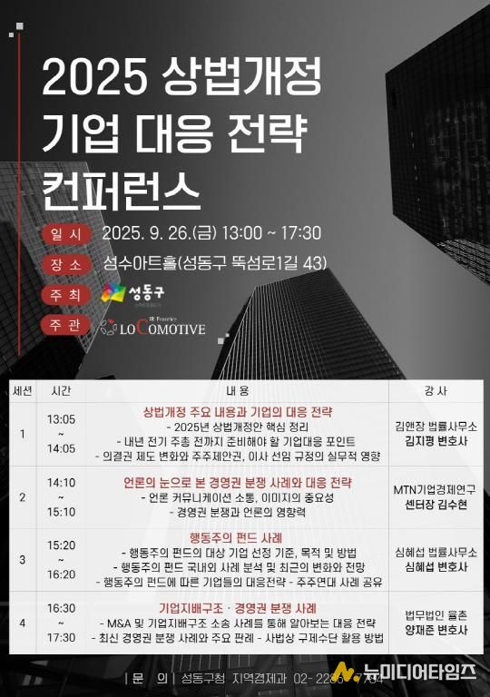 서울 성동구는 지난달 26일 성수타운매니지먼트(Seongsu Town Management) 사업의 일환으로 진행된 '2025 상법개정과 기업의 대응전략' 컨퍼런스를 성공적으로 마쳤다고 밝혔다.