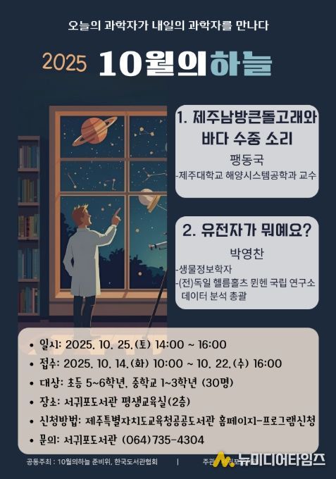 제주도교육청 서귀포도서관은 25일 오후 2시부터 서귀포도서관 평생교육실에서 한국도서관협회 및 ‘10월의 하늘’ 준비위원회와 함께 ‘10월의 하늘’ 프로그램을 운영한다.