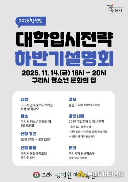 구리시는 ‘2026학년도 대학입시 전략 하반기 설명회’ 참석자를 오는 10월 17일부터 구리시 통합예약 포털을 통해 선착순 110명까지 신청받는다고 밝혔다.
