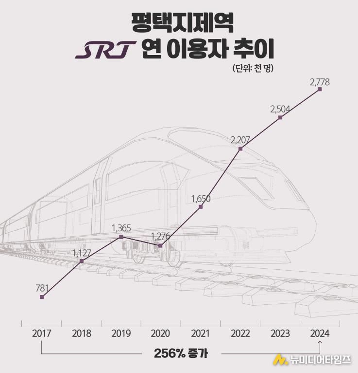 평택지제역은 2016년 개통 당시부터 SRT가 정차한 역사로, 매년 이용객 수가 꾸준히 증가하고 있다. 실제 ‘철도연감’에 따르면 평택지제역의 연간 SRT 승하차 인원은 2017년 78만 1천 명이었지만, 2024년에는 277만 8천 명으로 256%의 증가율을 기록했다. 이러한 증가율은 SRT 역사 중 가장 높은 수치다.