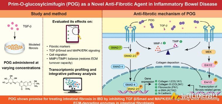연구진들은 장 섬유화(Intestinal fibrosis) 진행을 억제하는 새로운 치료전략이자 천연물 유래 성분 ‘Prim-O-glucosylcimifugin(POG)’의 기능을 밝혀냈다.