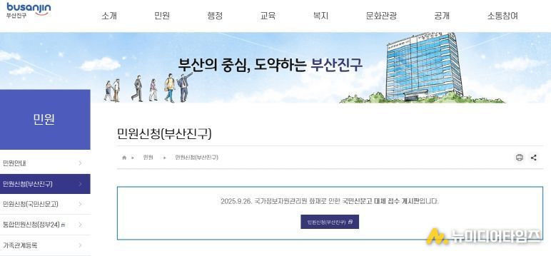 국가정보자원관리원 화재로 국민신문고 시스템 장애가 지속되는 가운데 부산진구는 민원 불편을 최소화하고자 구청 홈페이지에 ‘민원신청(부산진구)' 창구를 10월 10일부터 운영하고 있다고 밝혔다.