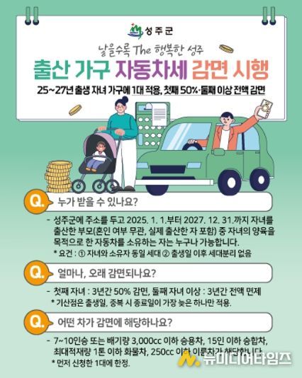 성주군은 13일 올해를 포함해 2027년까지 자녀를 출산한 가구를 대상으로 자동차세를 50%(둘째 자녀 이상 전액) 감면한다고 밝혔다.