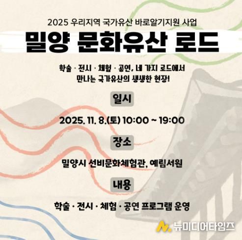 밀양문화관광재단은 오는 11월 8일 오전 10시부터 오후 7시까지 예림서원과 선비문화체험관 일원에서 지역 무형유산의 가치를 시민과 함께 나누는 ‘밀양 문화유산 로드’를 개최한다고 13일 밝혔다.
