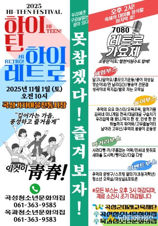 한편, 2025 곡성청소년 하이틴 페스티벌 ‘HI-TEEN, HI-RETRO’는 청소년들의 문화적 감성과 창의성을 표현할 수 있는 장으로, RETRO 가요제, 체험·놀이·먹거리·이벤트 부스 등 총 28개의 부스가 운영될 예정이다. 행사는 오는 11월 1일 곡성기차마을전통시장 일원에서 개최될 예정이다.