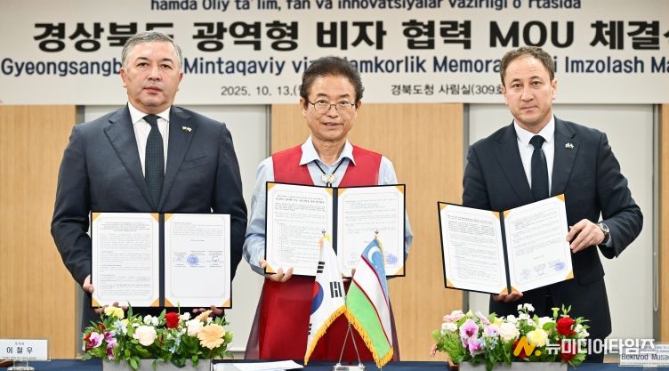 경상북도는 13일 도청 사림실에서 이철우 경상북도지사, 우즈베키스탄 베흐조드 무사예프 대외 노동청장, 타히르존 사파로브 대통령실 담당관 등이 참석한 가운데, 우즈베키스탄 대외 노동청 및 고등교육과학혁신부와 ‘경상북도 광역형 비자 업무협약’을 체결했다.